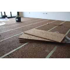 Otra aplicación muy habitual es como aislante acústico al impacto bajo parquets y tarimas. La aplicación de 10 mm de corcho bajo el pavimento reduce considerablemente el ruido de pisadas, tacones, movimiento de sillas, golpes, etc.